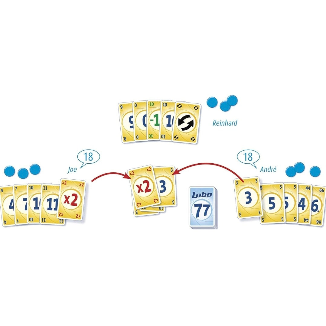 In Lobo 77 leggen de spelers om de beurt genummerde (0-76) handkaarten af op de gemeenschappelijke aflegstapel (en neemt hierna een nieuwe handkaart van de trekstapel). Maar let op: zorgt een gelegde kaart ervoor dat het totaal de 77 overschrijdt of eindigt op een veelvoud van elf ? Dan is deze speler uitgeschakeld en moet hij een van zijn drie ‘overlevingschips’ afgeven. De laatste speler die overblijft wint het spel.