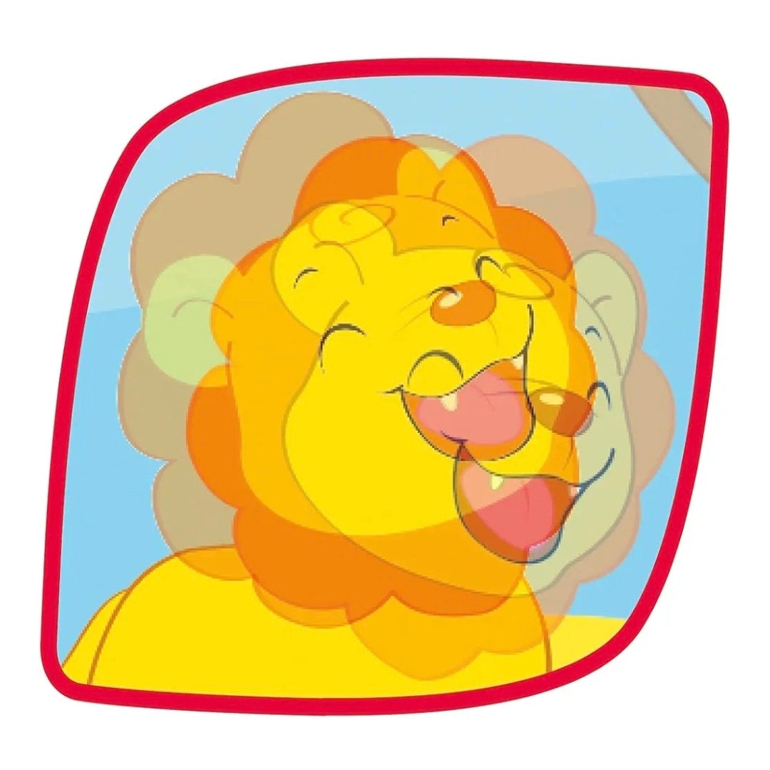 De spiegel heeft aan één kant een spiegeloppervlak en aan de andere kant een bewegend beeld met dierenmotieven.