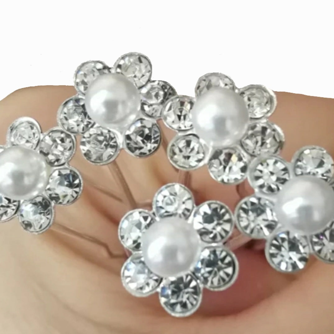 Mooie haarpinnetjes met bloemvormig glinsterende kristallen met witte parel. Mooi voor uw bruidskapsel / feest of andere speciale gelegenheden. Staat mooi in opgestoken haar en blijft stevig bevestigd zitten door de lange pins.