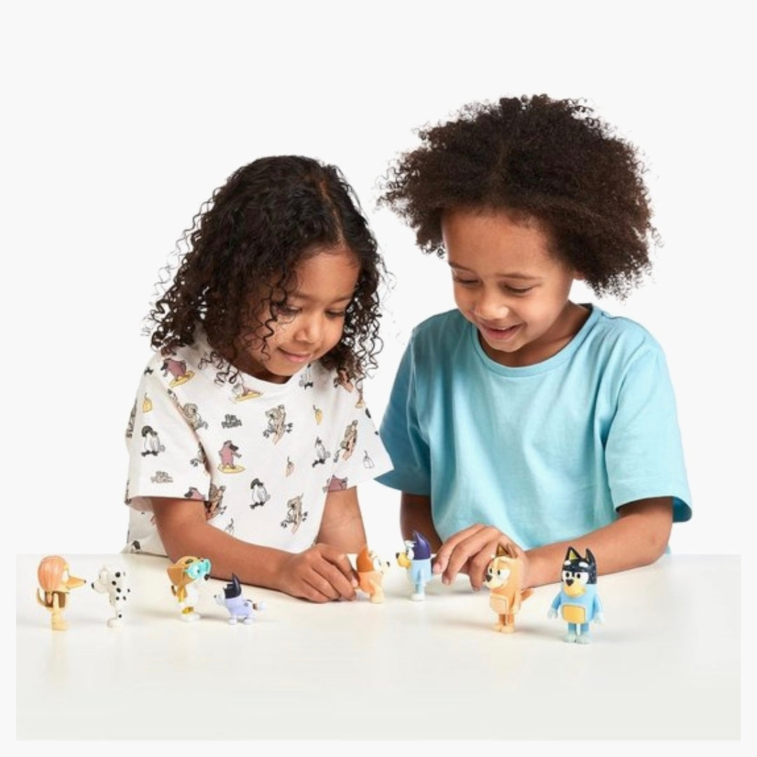 Kijk jij ook altijd naar de avonturen van Bluey? Bluey is een 6 jaar oude Heeler-hond die samen met haar familie de leukste avonturen beleeft. Speel nu met de 8 familie & vrienden speelfiguurtjes van Bluey, Bingo, Bandit, Chilli, Socks, Honey, Chloe en Indy. Hun armen en benen zijn beweegbaar, dus je kunt ze in allerlei poses neerzetten. Perfect voor kleine handjes om mee te spelen! Gebruik deze 8 speelfiguurtjes met de verschillende andere speelsets van Bluey. Leeftijdsindicatie: 3 jaar+.