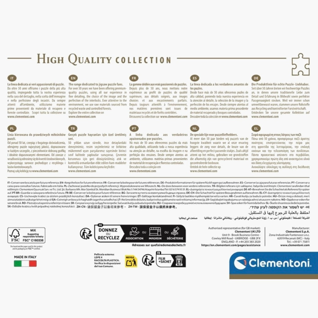 Puzzel voor kinderen of volwassenen, 1000 stukjes Afmetingen complete puzzel: 70 x 50 cm De meest aansprekende afbeeldingen, de grootste verscheidenheid aan formaten en de kenmerkende Clementoni-kwaliteit voor een reeks die overal de gouden standaard is voor liefhebbers van puzzels. Clementoni houdt altijd rekening met het milieu en maakt daarom veelvuldig gebruik van gerecyclede materialen, waarbij gebruik van vervuilende onderdelen wordt vermeden. Made in Italy