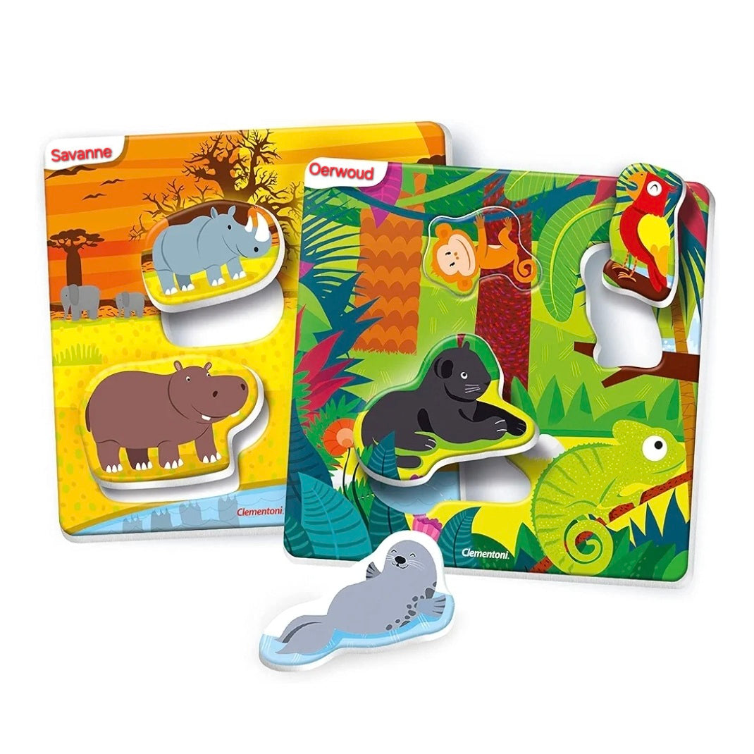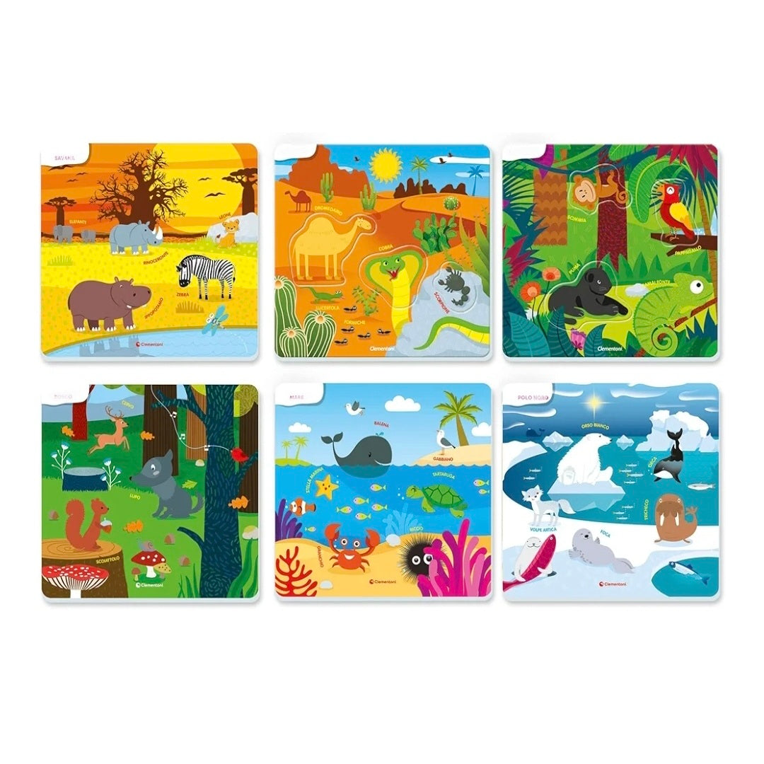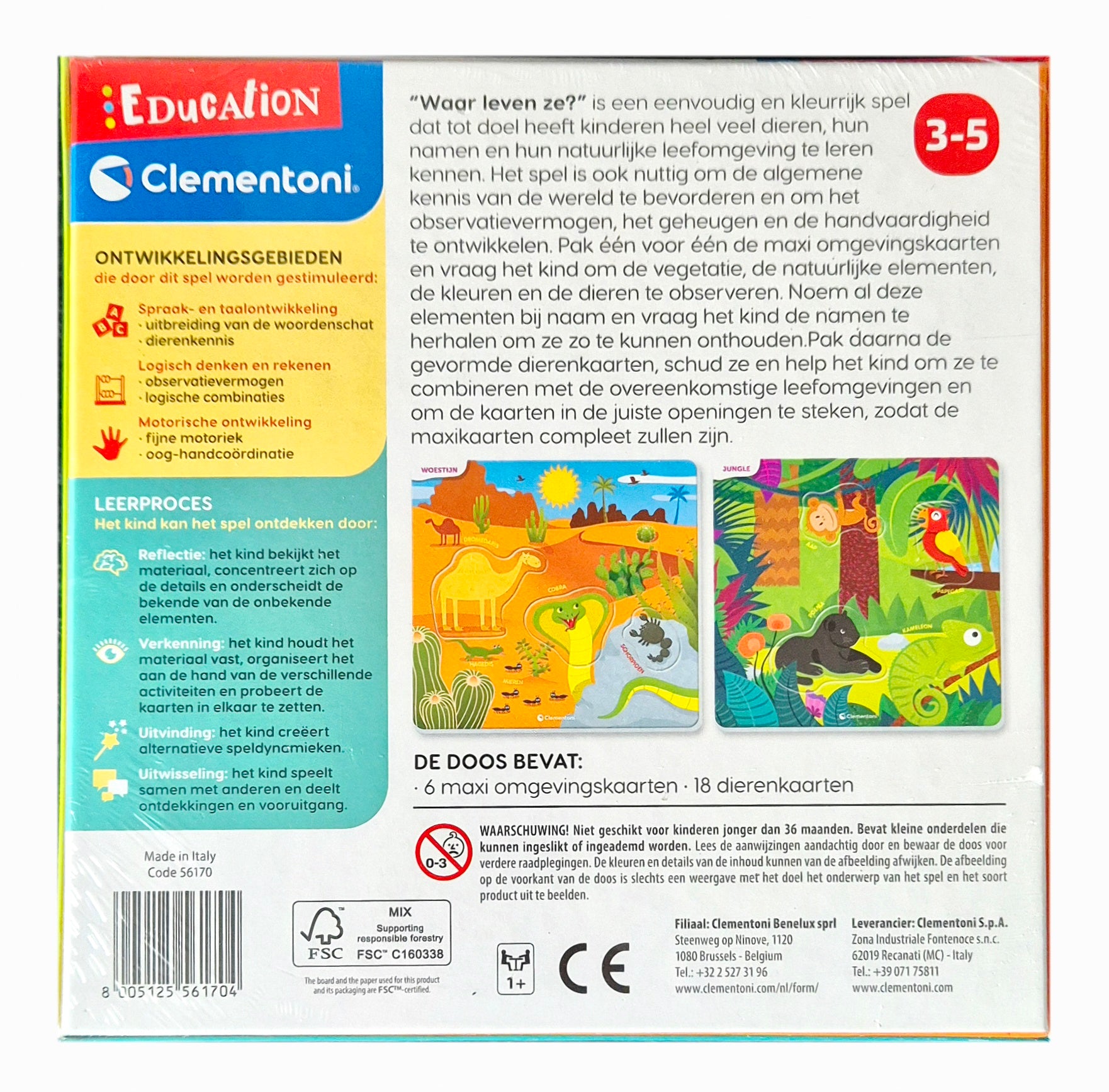 Clementoni leerspel Waar leven ze? Dit leuke bordspel combineert het klassieke bingo met een ontdekkingstocht naar de fascinerende dierenwereld. De bladen zijn verdeeld in thema’s op basis van de leefomgeving van de dieren. Kinderen kunnen ze samenstellen en personaliseren door hun favoriete dieren toe te voegen. Het spel stimuleert de observatie- en associatievaardigheden en laat het kind kennismaken met de dierenwereld.