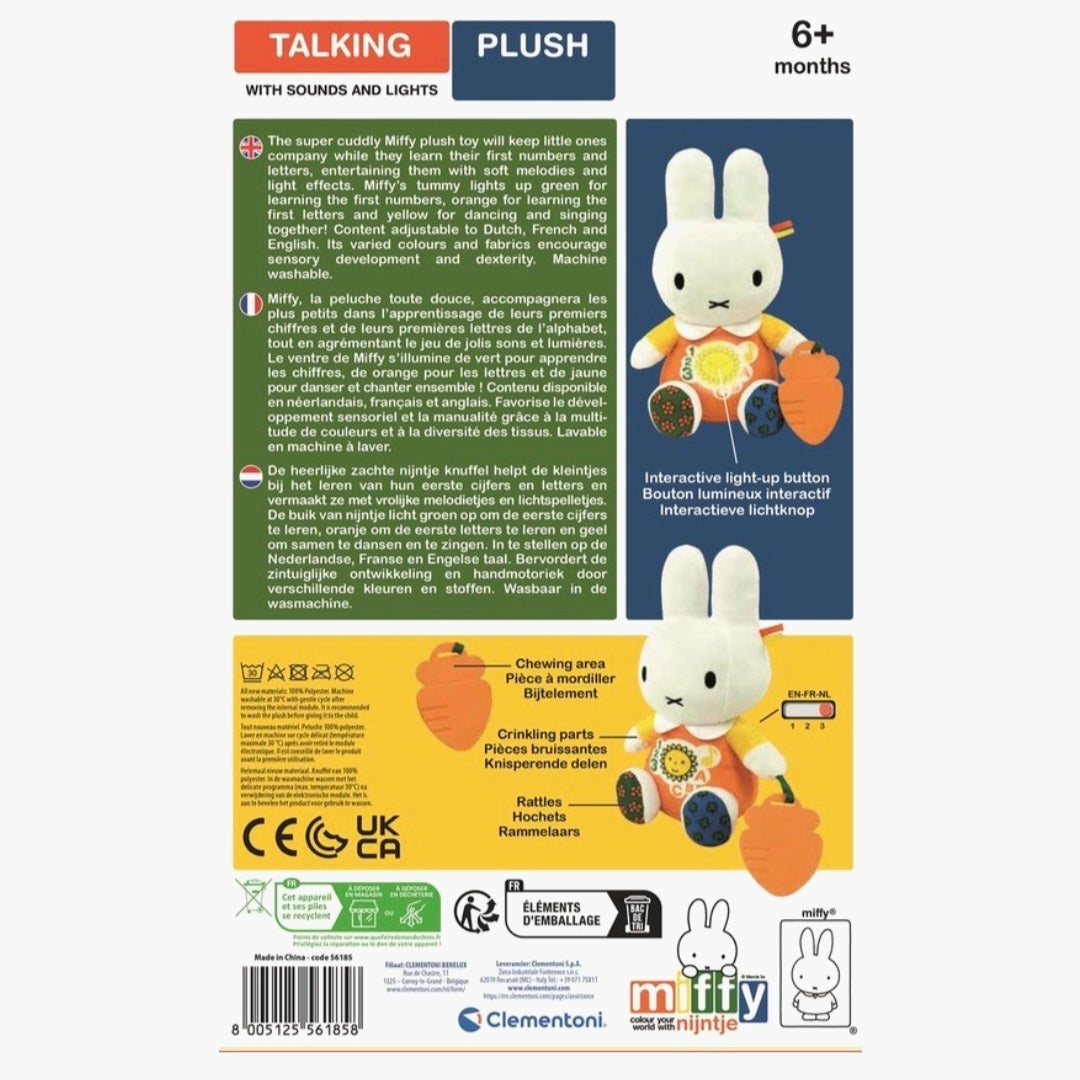 Of je baby nu net z’n eerste woordjes heeft geleerd of juist al zinnen maakt; met deze pratende Nijntje gaat zijn of haar taalvaardigheid hard vooruit. De heerlijke zachte knuffel helpt kleintjes hun eerste cijfers en letters te leren. De buik kleurt groen om cijfers te leren en oranje om letters te leren.