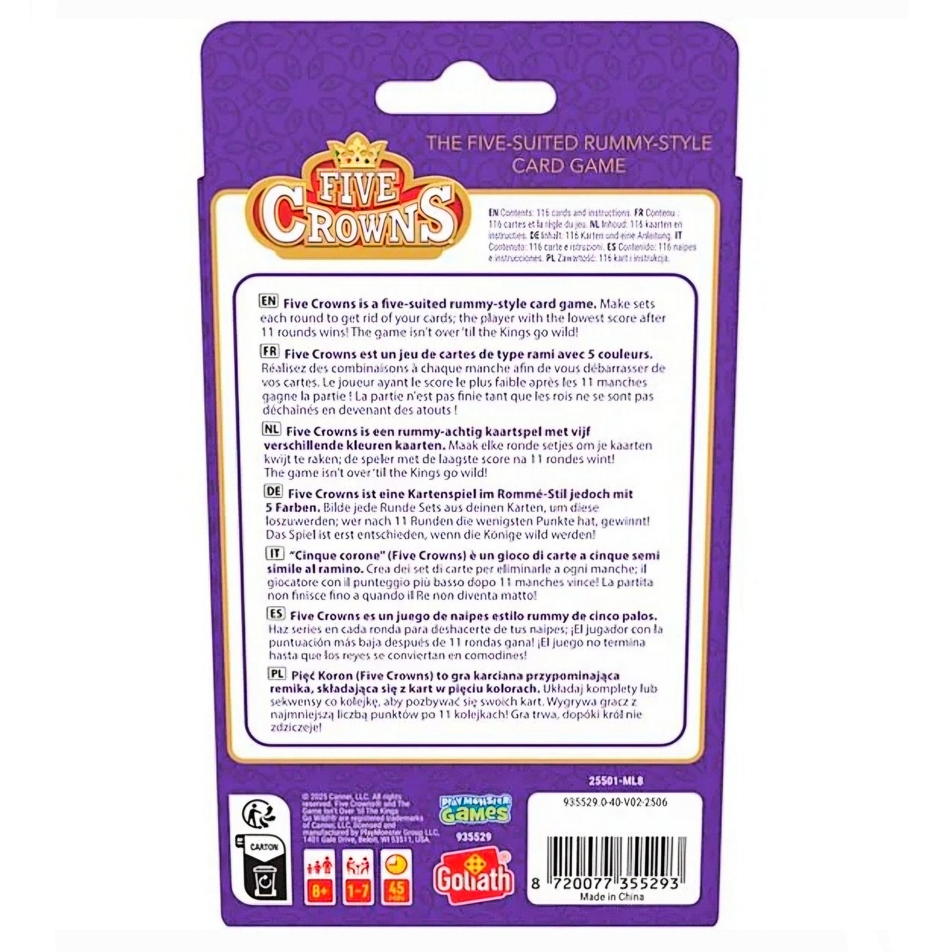 In Five Crowns speel je elke ronde met een wisselend aantal kaarten. Je probeert sets en runs te maken en zo min mogelijk strafpunten over te houden. Wat het spel extra spannend maakt, is dat de jokers elke ronde veranderen: eerst zijn alleen de boeren wild, maar uiteindelijk worden ook de koningen wild! De speler met de laagste score aan het einde van het spel wint.