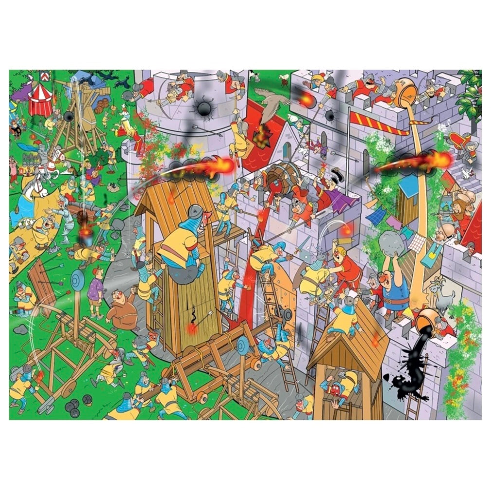 Type: Cartoon-stijl puzzel met veel details en humoristische scènes rondom een kasteelbelegering