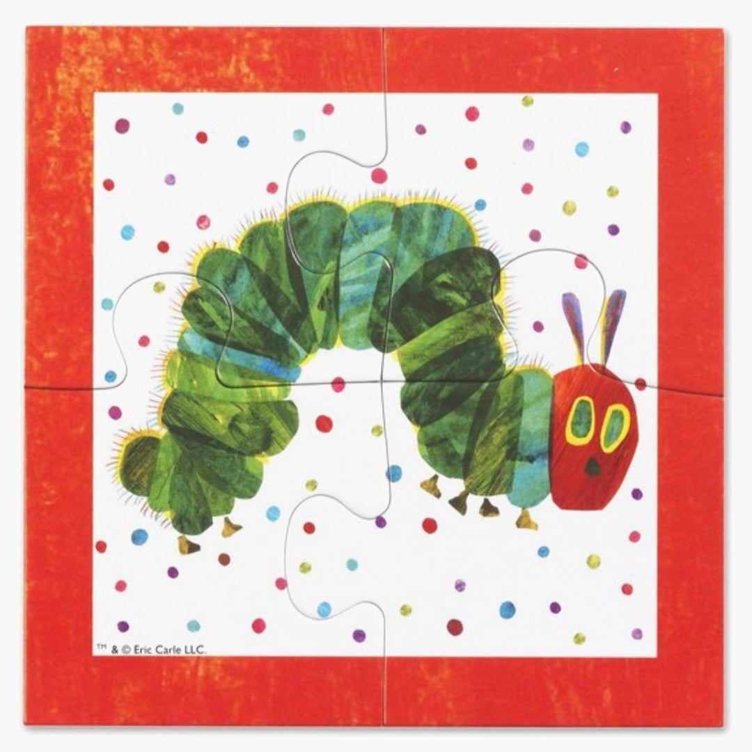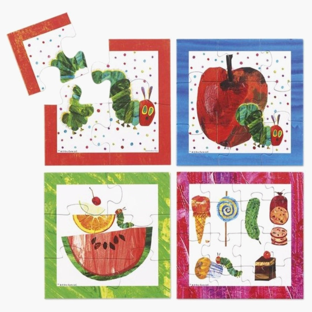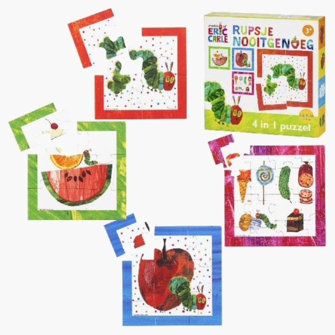Deze set bestaat uit 4 puzzels met bontgekleurde afbeeldingen uit het boek Rupsje Nooitgenoeg van Eric Carle. Hierin gaat het rupsje op zoek naar heerlijke hapjes die je ook terug ziet op de puzzels. De jongste puzzelaars beginnen met een puzzel van 4 stukken en wie toe is aan de volgende uitdaging kan een puzzel van 6, 9 of 16 stukken leggen.