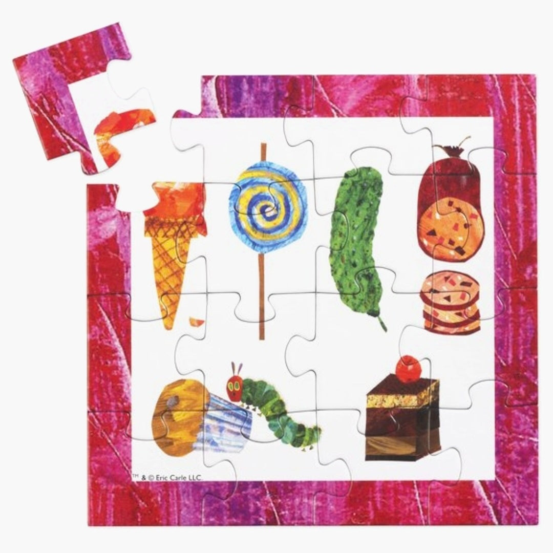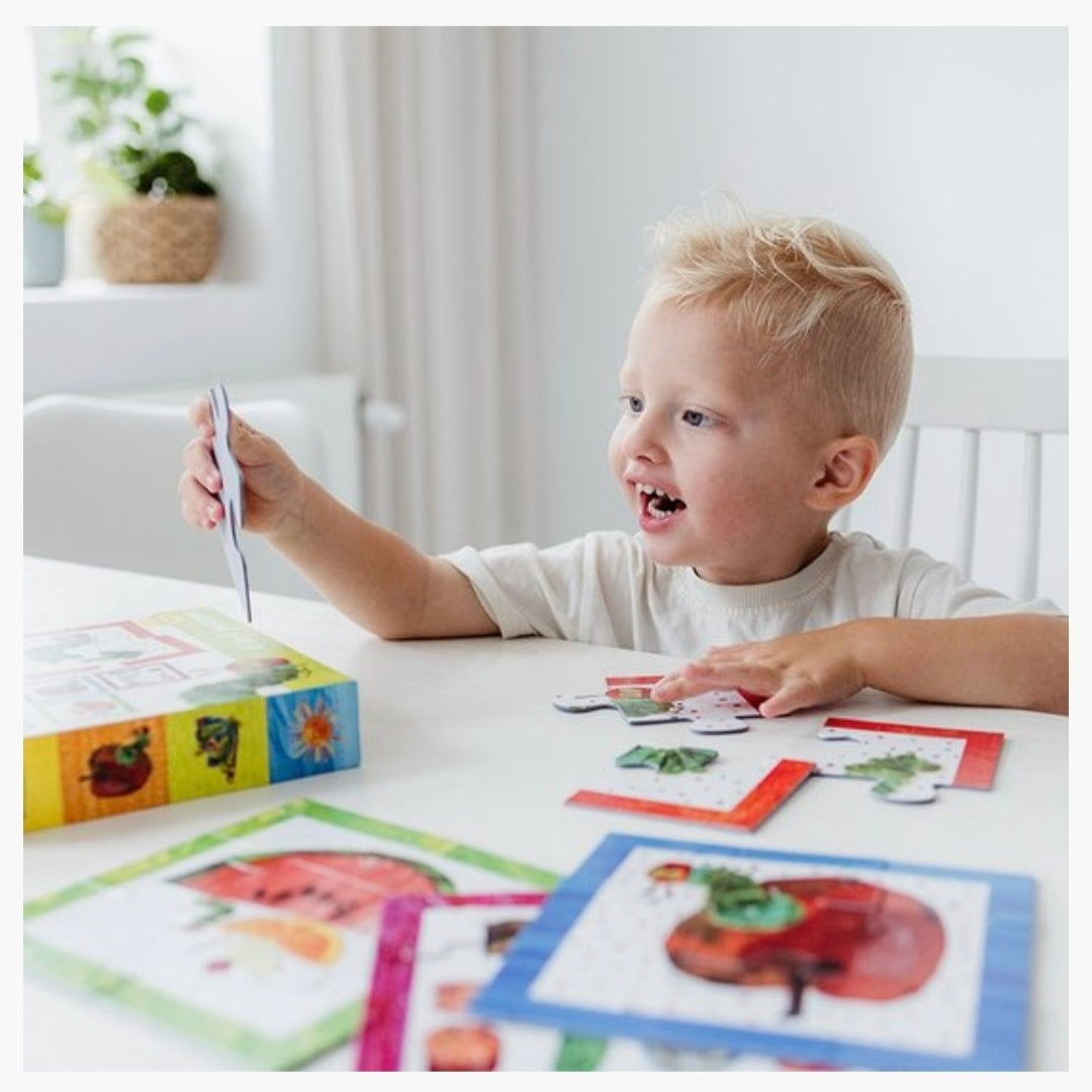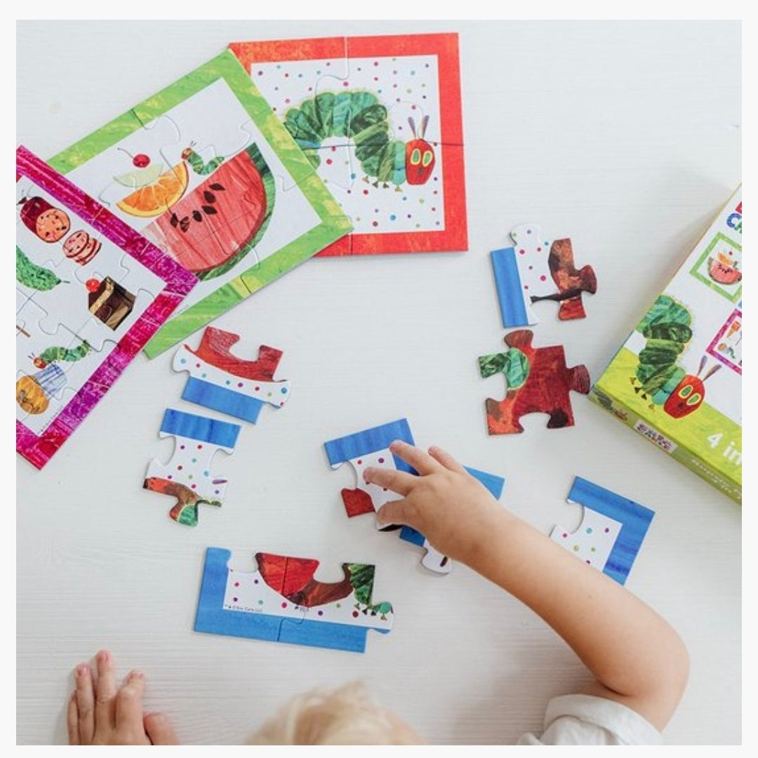 Deze set bestaat uit 4 puzzels met bontgekleurde afbeeldingen uit het boek Rupsje Nooitgenoeg van Eric Carle. Hierin gaat het rupsje op zoek naar heerlijke hapjes die je ook terug ziet op de puzzels. De jongste puzzelaars beginnen met een puzzel van 4 stukken en wie toe is aan de volgende uitdaging kan een puzzel van 6, 9 of 16 stukken leggen.