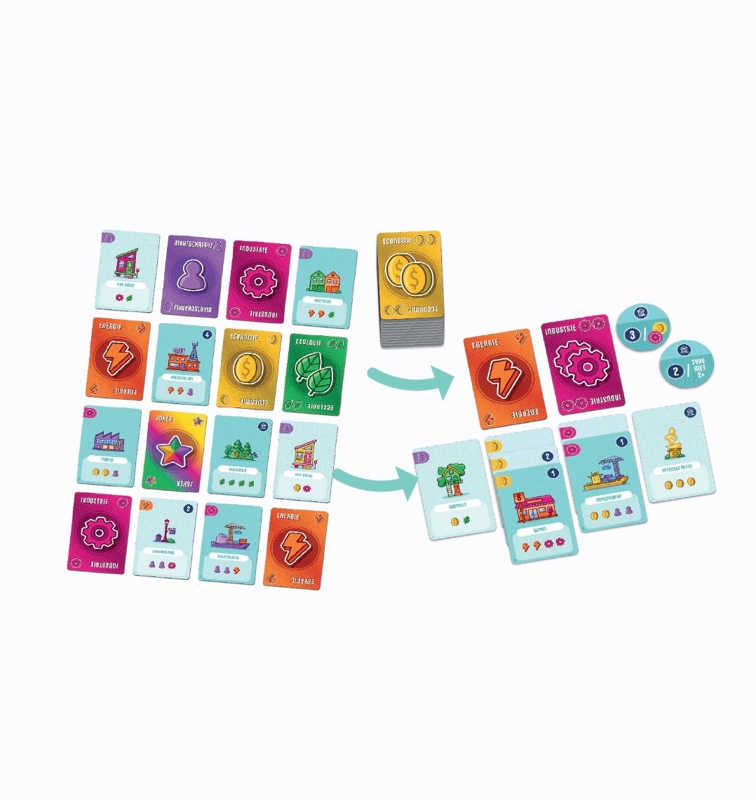 De regels zijn simpel: neem twee aangrenzende kaarten van het dynamische stadsraster en voeg ze toe aan je alsmaar verder groeiende stad. Gebruik je grondstofkaarten en bonussen om gebouwkaarten te bopuwen die specifieke combinaties vereisen. Bouw speciale algemene gebouwen om de punten van je stad te vermenigvuldigen en de beste stedenbouwkundige te worden!